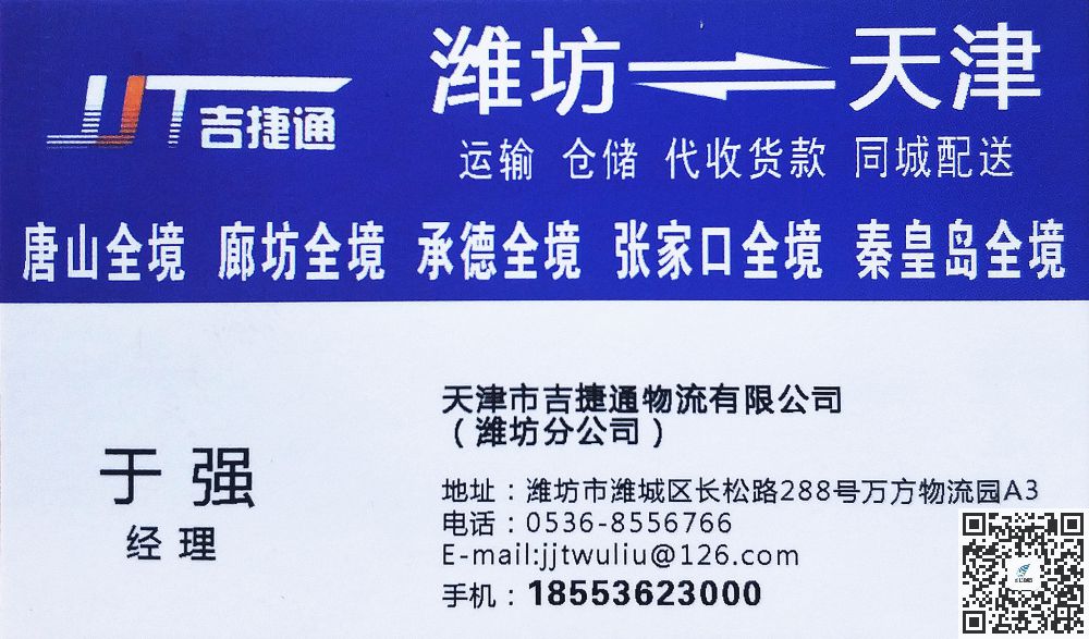 [置顶] 山东省潍坊市 河北省廊坊市中转地:天津市吉捷通物流有限公司(潍坊分公司)时效12小时特快天重货元/吨轻货元/m³联系人:张占庚电 话:18553623000信 誉: